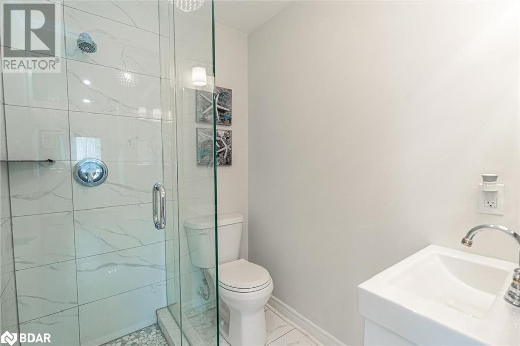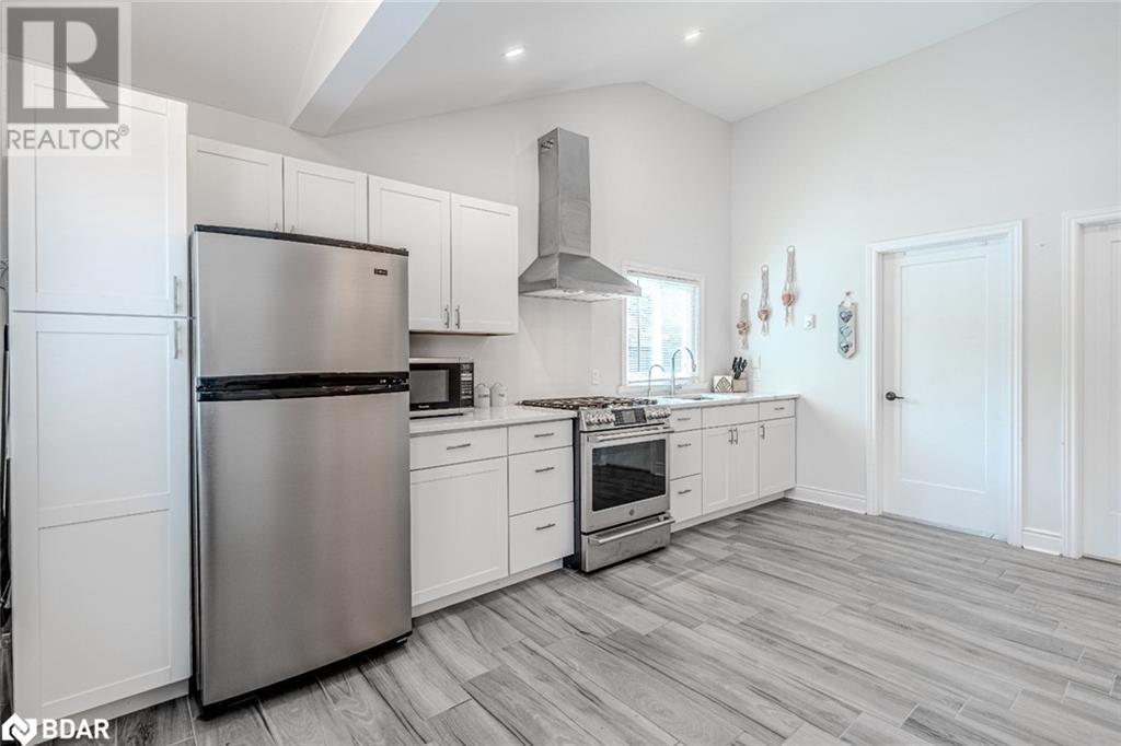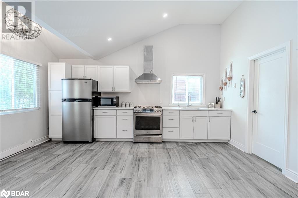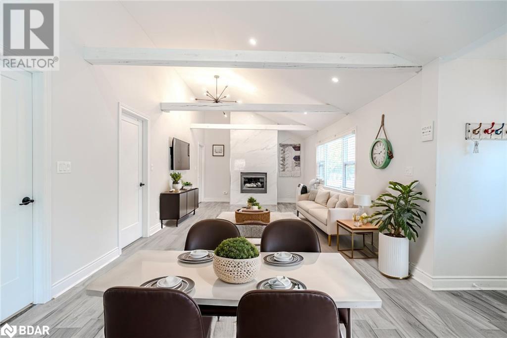 BEAUTIFULLY RENOVATED BUNGALOW JUST A SHORT WALK TO THE BEACH! This completely renovated bungalow is a true gem, with all the big-ticket items already taken care of so you can move in and enjoy it right away. Set in a peaceful area, this home is tucked away from the road and surrounded by mature trees, offering a private, tranquil setting. Beach lovers will appreciate the proximity to Georgian Bay, Edmore Beach, and just a short drive to Wasaga Beach. The spacious 75 x 200 ft lot with a patio area and a shed provides endless possibilities for outdoor fun or creating your own peaceful retreat. Updated shingles and windows offer peace of mind, while extensive renovations, including upgraded insulation, electrical, plumbing, hardware and light fixtures, bring the home up to modern standards. Inside, the open-concept design features a vaulted ceiling, pot lights, and easy-care ceramic tile flooring that beautifully mimics wood planks, giving the space warmth and texture. The modern kitchen is a highlight, with white cabinets, quartz countertops, stainless steel appliances, and a gas stove with a sleek range hood. The cozy living room features a propane fireplace with a bump-out and a striking herringbone floor pattern in front. The primary bedroom hosts an updated 3-piece ensuite, while the other bathroom has also been upgraded. With thoughtful updates and a prime location near the beach, this bungalow is the ultimate retreat for relaxed, everyday living! (id:45412)